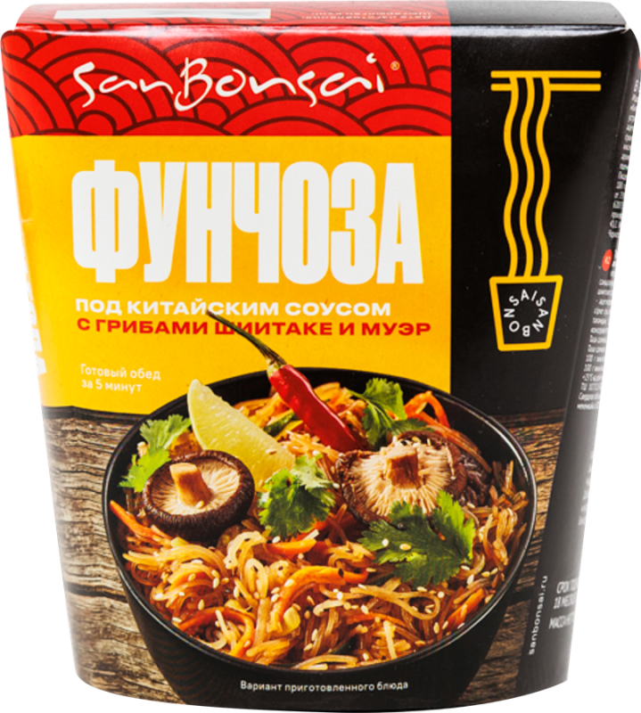 Вермишель SANBONSAI Фунчоза под китайским соусом – умеренно острая вермишель быстрого приготовления под китайским соусом с грибами шиитаке и муэр. Это быстрый способ приготовить вкусный легкий обед в паназиатском стиле.