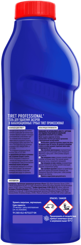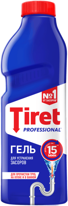 Гель для удаления засоров в канализационных трубах Professional TIRET устраняет засоры лучше, чем традиционные методы и средства. Густая структура геля позволяет ему проникать глубоко в трубу. Продукт убивает бактерии и устраняет неприятные запахи. Средство идеально подходит и является безопасным для всех видов металлических и пластиковых труб.