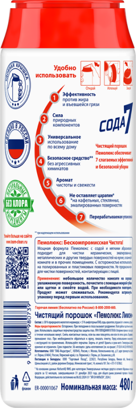 Порошок для чистки ПЕМОЛЮКС Лимон ‒ универсальное средство для уборки дома. Порошок ПЕМОЛЮКС ‒ это 7 преимуществ быстрой и эффективной уборки. Пемолюкс не оставляет царапин во время уборки на кафельных, стеклянных, эмалированных поверхностях. Средство эффективно борется с въевшейся грязью и жиром на любых поверхностях. Формула порошка ПЕМОЛЮКС имеет натуральную основу и силу природных компонентов. Средство поможет навести чистоту во всех бытовых помещениях. Порошок не содержит агрессивных химикатов, безопасен для посуды и кожи человека. Средство Пемолюкс дарит дому приятный аромат чистоты и свежести. Перерабатываемая упаковка. Порошок ПЕМОЛЮКС – бренд номер 1 в России (На основании данных NielsenIQ RMS для категории Универсальных чистящих средств в сегменте Абразивных чистящих средств за 12 месяцев, завершившихся 31 декабря 2023 года, для общего рынка розничной торговли в Российской Федерации, действительно по состоянию на 06.02.2024 («ЭЙ СИ НИЛЬСЕН», 2024г)). Эффективная и безопасная уборка – легко вместе с