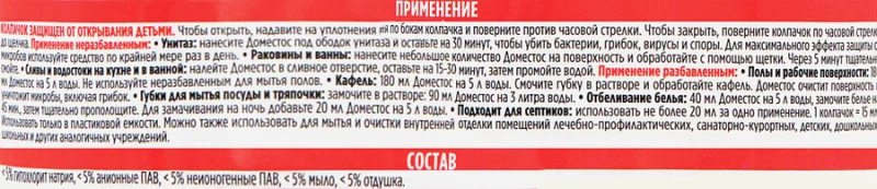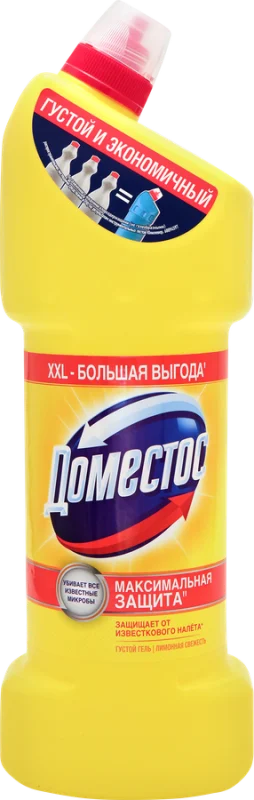 Средство для чистки ДОМЕСТОС уничтожает бактерии, споры грибков и микробы. Гель имеет приятный и легкий аромат лимона, который сохраняет свежесть в воздухе даже через некоторое время после уборки. Это универсальное средство, которое подходит как для чистки унитаза, так и для дезинфекции рабочих поверхностей. В неразбавленном виде гель используют для санитарной обработки, для дезинфекции помещений в период обострения вирусов, а также для регулярной уборки раковины, ванны и сливов, а в разбавленном – для отбеливания белья и обработки кафеля, паркета или линолеума.