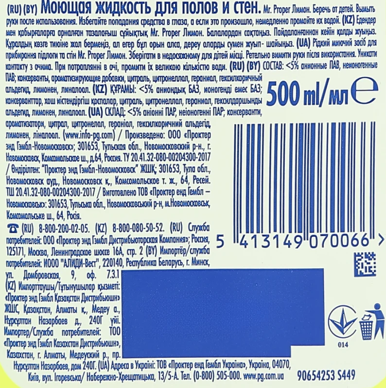 Средство для мытья полов и стен MR.PROPER с ароматом лимона – универсальное моющее средство. MR.PROPER идеально подходит для очищения практически любых твердых поверхностей в доме. Его можно использовать для мытья кухонных раковин, удаления жира с плиты и даже для пола. Подробные инструкции по применению указаны на упаковке. После очищения поверхностей, соприкасающихся с пищевыми продуктами, необходимо промыть их водой.