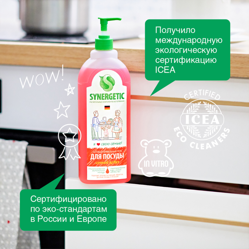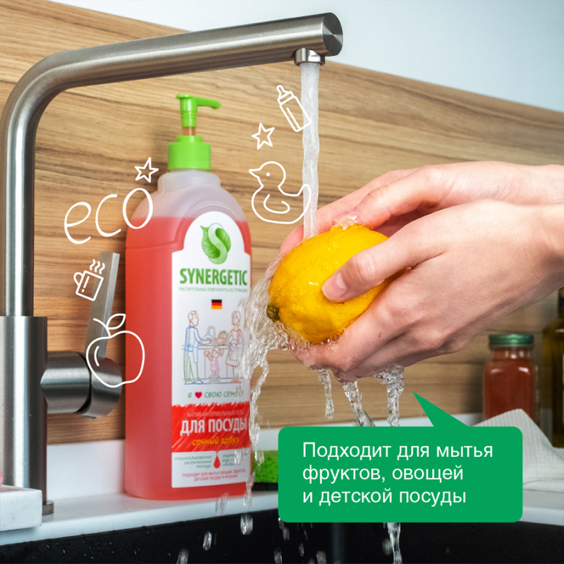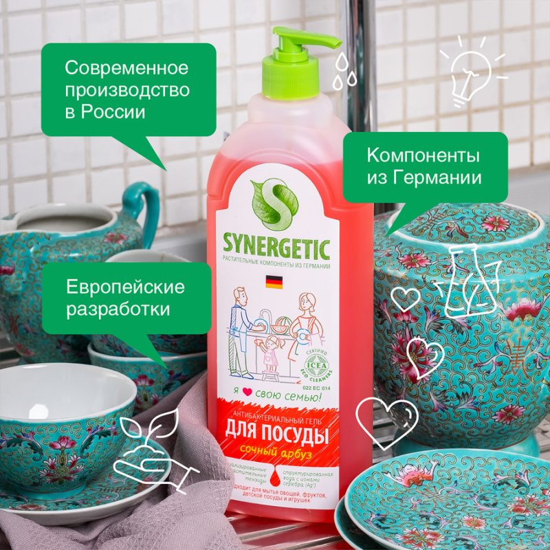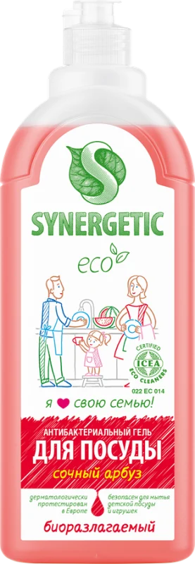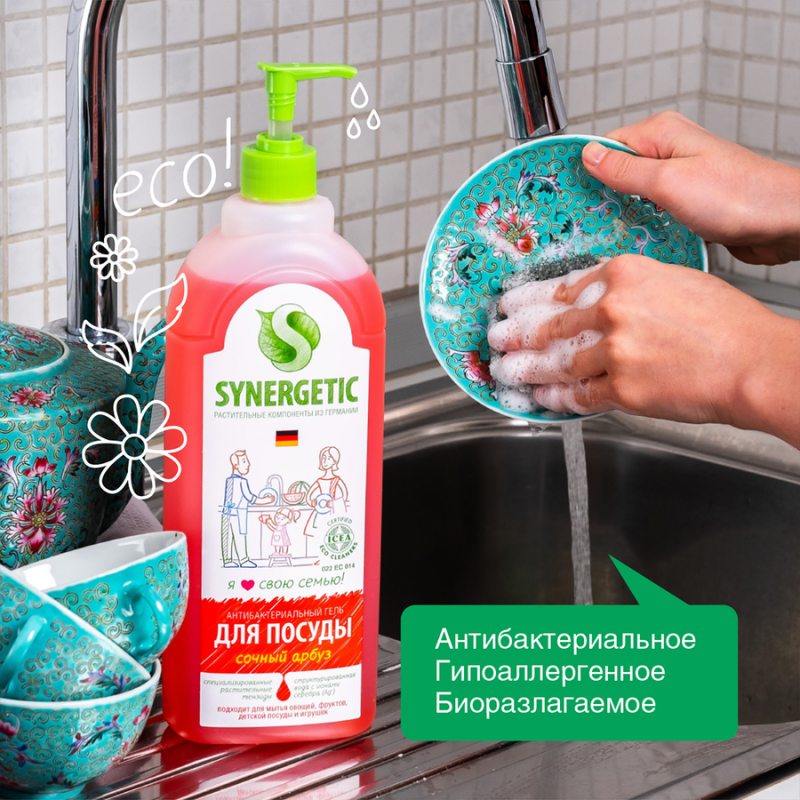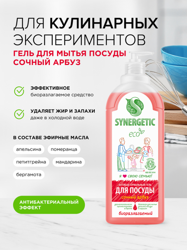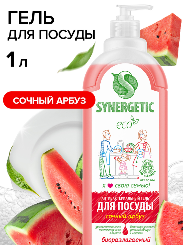 Средство для мытья посуды и детских игрушек SYNERGETIC биоразлагаемое с ароматом арбуза – это экологичное, безопасное и эффективное средство для мытья посуды, фруктов и овощей. Гель полностью смывается водой и подходит для мытья детской посуды, бутылочек и игрушек. Устраняет жир и запахи с посуды даже в холодной воде. Мягкие биоразлагаемые тензиды, полученные из растительного масла, удаляют органические загрязнения с посуды и обеспечивают хорошее пенообразование, не вызывая раздражения кожи рук. Средство содержит гипоаллергенные отдушки на основе эфирных масел и безопасные пищевые красители, поэтому подходит для людей с чувствительной кожей рук. Натуральный растительный глицерин в составе геля защищает кожу рук от сухости и раздражения. Гель для посуды SYNERGETIC сертифицирован в итальянском институте этической и экологической сертификации icea и имеет международный сертификат, подтверждающий биоразлагаемость, безопасность и эффективность средства на уровне лидеров европейского рынка бытовой химии.