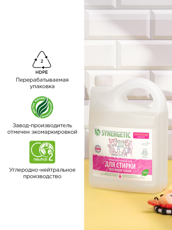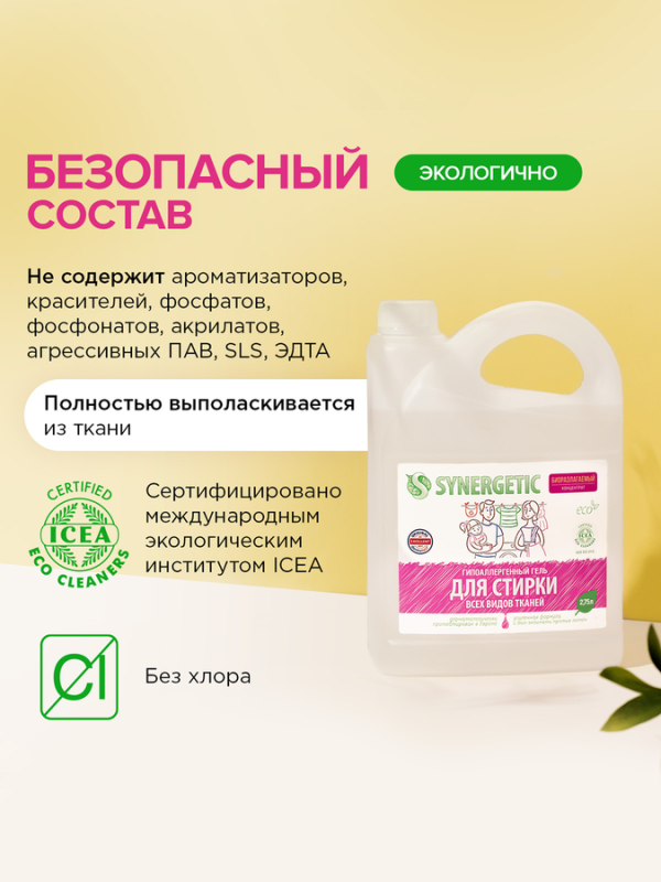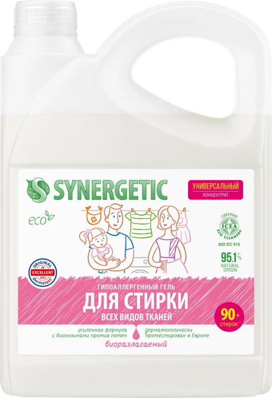 Гель SYNERGETIC – универсальное средство для стирки любых видов тканей с легким ароматом ландыша. В одном средстве слились приятный натуральный аромат и насыщенный состав суперконцентрата.