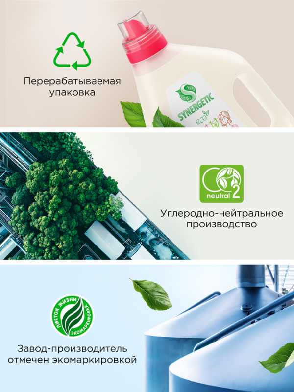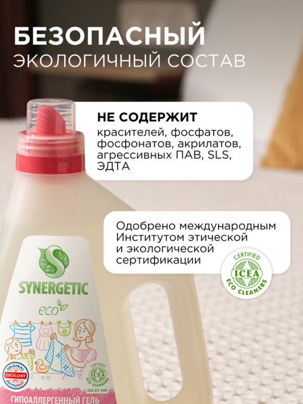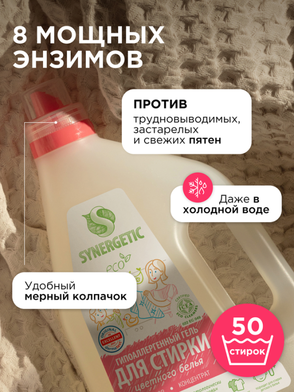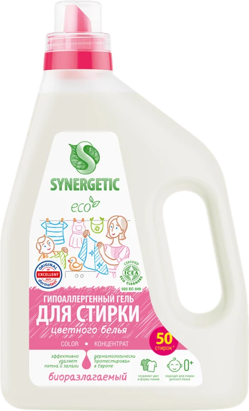 Гель для стирки SYNERGETIC Color биоразлагаемый концентрированный обеспечивает гигиеническую чистоту, устраняет неприятный запах и предотвращает его появление. Препятствует пожелтению ткани и общей потере цвета изделия, удаляя загрязнения глубоко в волокнах. Комбинация энзимов и растительных ПАВ эффективно удаляет загрязнения и пятна с волокон ткани даже в холодной воде и при коротких циклах стирки. Функциональные добавки предотвращают повторное оседание загрязнений на ткани, сохраняя ее первоначальный вид, насыщенность цвета, прочность и структуру. Препятствуют возникновению катышков, делая волокна более гладкими. Инновационные растительные полимеры защищают одежду, предотвращая от проникновения загрязнений глубоко в волокна ткани. Гель полностью выполаскивается из тканей, подходит для стирки детского белья 0+ и одежды людей с чувствительной кожей. Дерматологически протестирован институтом Dermatest в Германии. Содержит гипоаллергенную отдушку с эфирными маслами эвкалипта и апельсина. Биоразлагаемые компонен