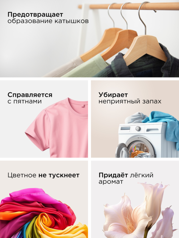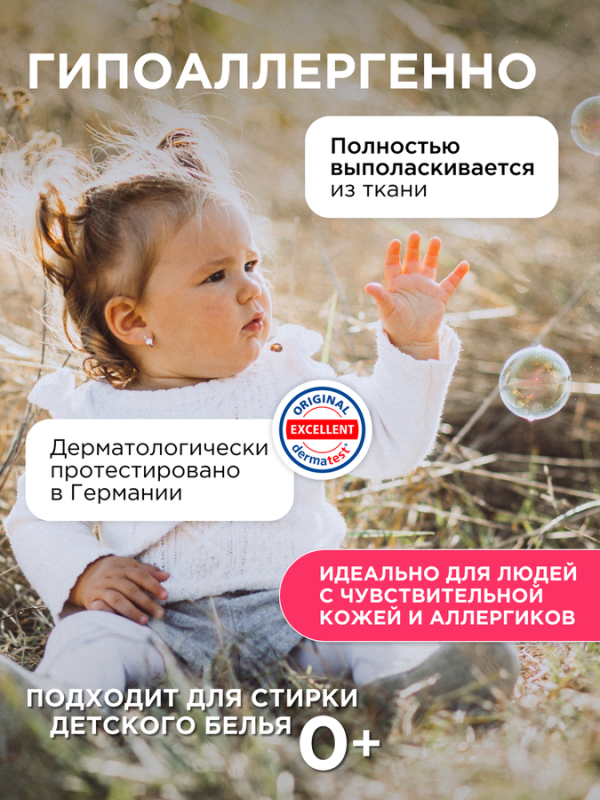 Подготовленная вода 30%, А-тензиды (ПАВ из растительного масла) 5–15%, Н-тензиды (ПАВ из растительного масла) 5%, глицерин 5%,зеленый хелат (ГЛДА) 5%, растительные антиресорбенты 5%, ингибитор переноса красителей 5%, энзимы без ГМО 5%, морская соль 5%,гипоаллергенная парфюмерная композиция с эфирными маслами эвкалипта и апельсина 5%, консерванты (бензоат натрия, формиат натрия)5%.