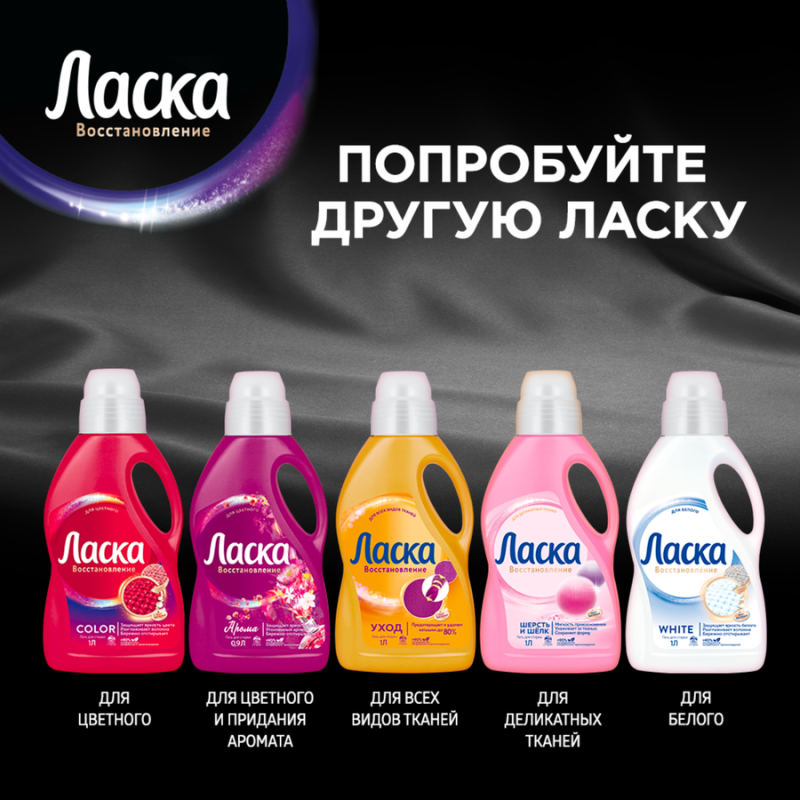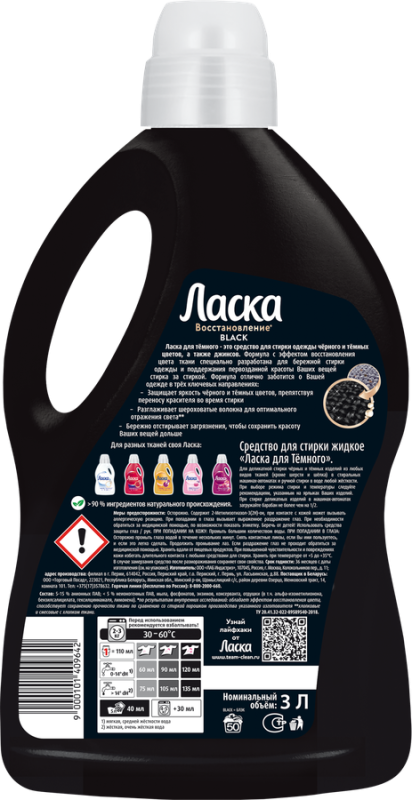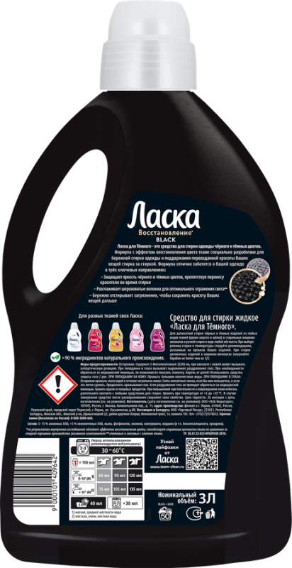 Гель для стирки темных вещей ЛАСКА Эффект восстановления Сияние черного для темного белья. Жидкий порошок ЛАСКА Восстановление для темного эффективно и бережно отстирывает загрязнения на одежде, восстанавливая яркость черного и темных цветов и сохраняя прочность волокон ткани. В отличие от обычного порошка, ЛАСКА содержит цветозащитные ингредиенты, которые поддерживают стойкость цвета одежды. Активные компоненты способствуют уменьшению количества катышков на ткани. Формула содержит более 90% ингредиентов натурального происхождения. Бережно и эффективно отстирывает загрязнения. Восстанавливает и защищает яркость цвета. Сохраняет форму ткани и препятствует появлению катышков. Не оставляет разводов. Гель ЛАСКА удобен в использовании: дозируйте жидкое средство согласно инструкции, заливайте его в отделение для стирального порошка или добавьте мерный колпачок со средством в барабан стиральной машины. Цвет геля может варьироваться от молочного до светло-фиолетового.