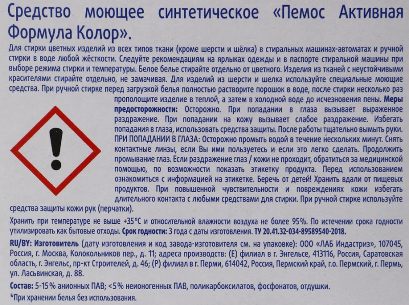 5–15% анионных ПАВ, 5% неионогенных ПАВ, фосфонатов, мыла, энзимов, консерванта, отдушки (в том числе лимонена), красителя.