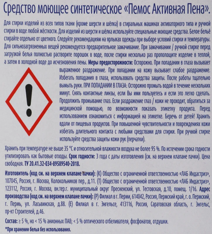 5–15% анионных ПАВ, 5% неионогенных ПАВ, мыла, фосфонатов, энзимов, консерванта, отдушки (в том числе гексилциннамаля,цитронеллола).