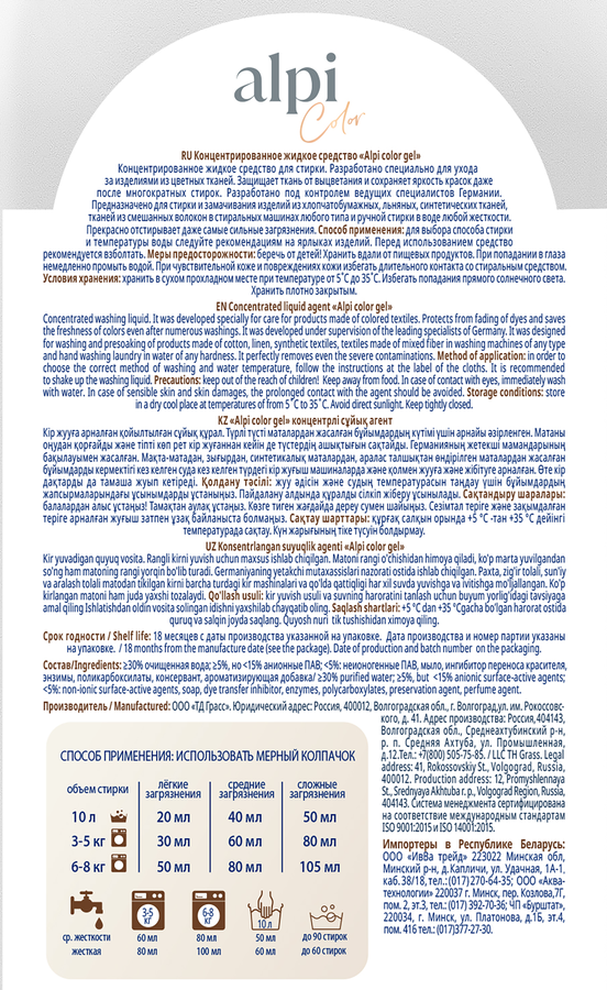 Средство жидкое для стирки GRASS Alpi Color gel, 1,8л