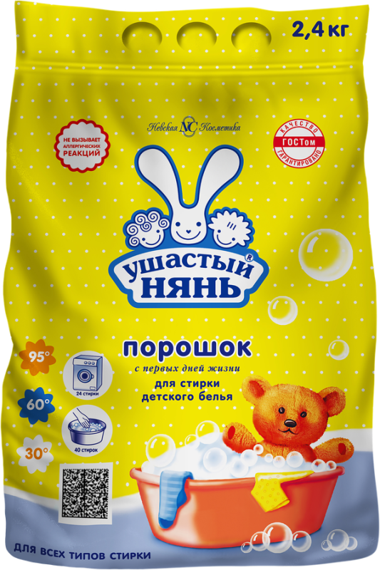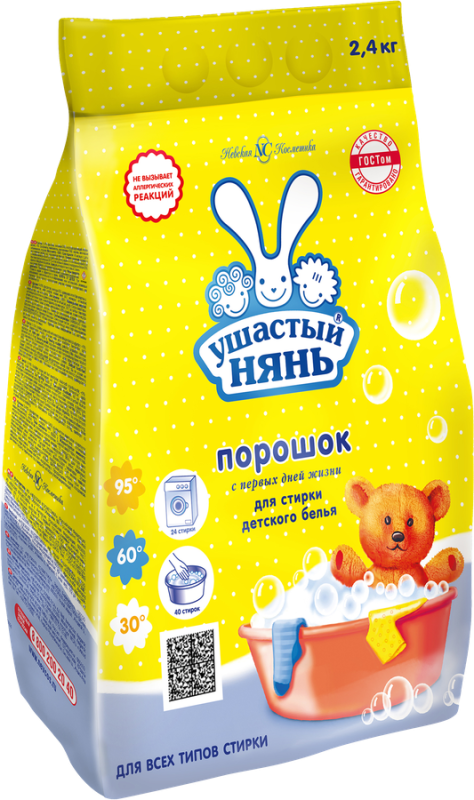 Стиральный порошок УШАСТЫЙ НЯНЬ подходит для белья и одежды детей любого возраста, в том числе новорожденных. Эффективно справляется с пятнами от молока, фруктовых и овощных пюре, соков, каш, яиц, а также продуктов жизнедеятельности малышей. Начинает действовать уже в процессе замачивания и удаляет загрязнения уже в воде низкой температуры, поэтому при стирке нет необходимости застирывать и кипятить белье.