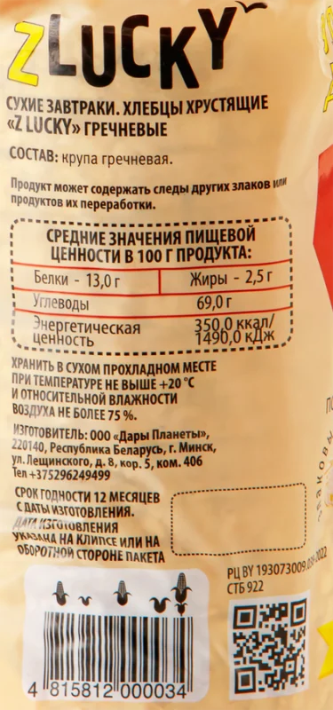 Хлебцы гречневые Z LUCKY хрустящие – натуральный продукт, который понравится сторонникам здорового питания и тем, кто следит за фигурой. Легкие и хрустящие хлебцы приготовлены из цельного зерна злаковых культур и круп. Их можно употреблять отдельно, использовать для приготовления аппетитных бутербродов. Хлебцы быстро утоляют голод, заряжают энергией, улучшают работу желудочно-кишечного тракта, снижают риск сердечно-сосудистых заболеваний.
