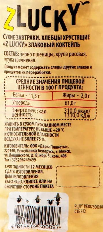 Хлебцы мультизлаковые Z LUCKY хрустящие – натуральный продукт, который понравится сторонникам здорового питания и тем, кто следит за фигурой. Легкие и хрустящие хлебцы приготовлены из цельного зерна злаковых культур и круп. Их можно употреблять отдельно, использовать для приготовления аппетитных бутербродов. Хлебцы быстро утоляют голод, заряжают энергией, улучшают работу желудочно-кишечного тракта, снижают риск сердечно-сосудистых заболеваний.