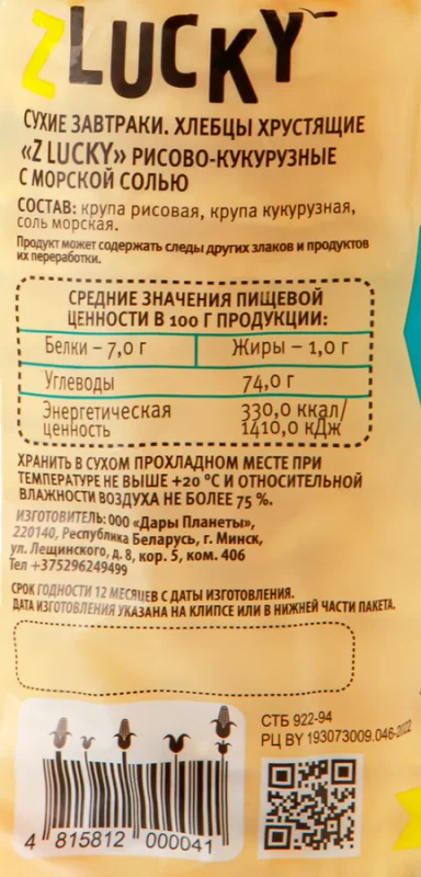 Хлебцы рисово-кукурузные Z LUCKY хрустящие, с морской солью, 95г