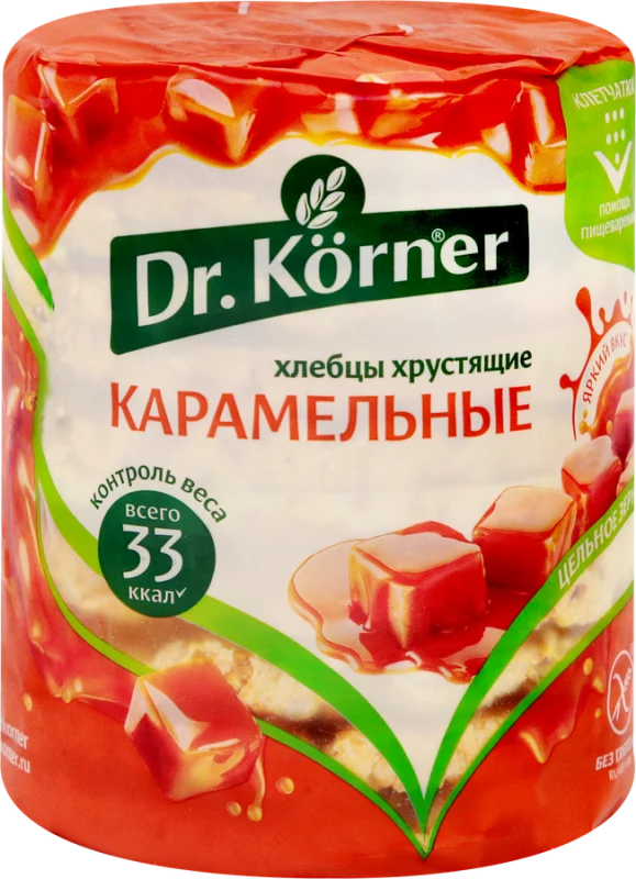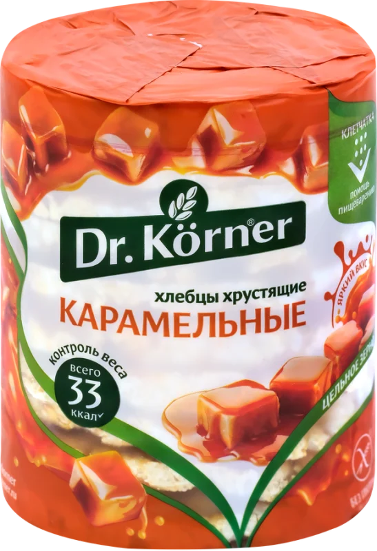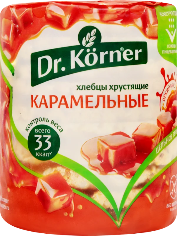 Хлебцы кукурузно-рисовые DR KORNER Карамельные являются прекрасной альтернативой для любителей сладких лакомств, стремящихся к поддержанию хорошей физической формы. Хлебцы содержат клетчатку, способствующую сжиганию калорий. Сладкие хлебцы не содержат сахар: только фруктозу и сукралозу.
