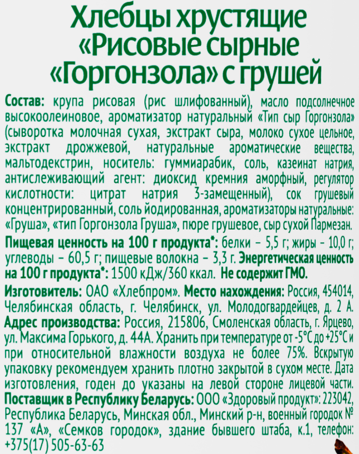 Крупа рисовая (рис шлифованный), масло подсолнечное высокоолеиновое, ароматизатор натуральный Тип сыр Горгонзола (сывороткамолочная сухая, экстракт сыра, молоко сухое цельное, экстракт дрожжевой, натуральные ароматические вещества, мальтодекстрин,носитель – гуммиарабик, соль, казеинат натрия, антислеживающий агент – диоксид кремния аморфный, регулятор кислотности – цитратнатрия 3-замещенный), сок грушевый концентрированный, соль йодированная, ароматизаторы натуральные (груша, тип горгонзола груша),пюре грушевое, сыр сухой Пармезан.