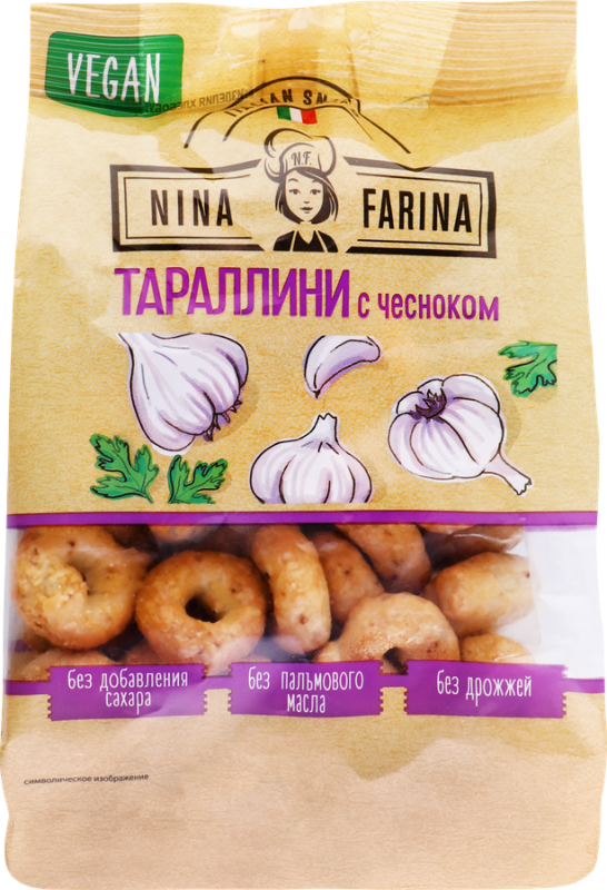 Тараллини NINA FARINA производятся из муки высшего сорта, подсоленной воды, высокоолеинового подсолнечного масла и сушеного чеснока. Ароматные, тающие во рту, с легким чесночным ароматом – идеальны в качестве перекуса, закуски к аперитиву. Подойдут для постного и веганского меню. Вкусный и полезный перекус для любителей похрустеть любого возраста.