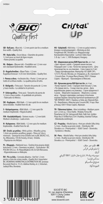 Ручка BIC Cristal Up представлена в блестящем белом корпусе и оснащена белым колпачком с яркими элементами в цвет чернил. Это трендовая версия легендарной ручки BIC Cristal – первой шариковой ручки, созданной компанией BIC еще в 1950 году. Доступна в четырех цветах – синем, черном, зеленом и красном. Безупречно спроектированный шарик ручки обеспечивает равномерную и плавную подачу чернил. Широкий пишущий узел диаметром 1.2 мм идеален для письма кристальной четкости. Уже более 65 лет BIC производит письменные принадлежности высокого качества, которые продаются по всему миру для каждого и по доступной цене. Такая миссия помогла когда-то маленькой французской компании завоевать доверие потребителей и стать одним из мировых лидеров в категории канцелярских товаров.