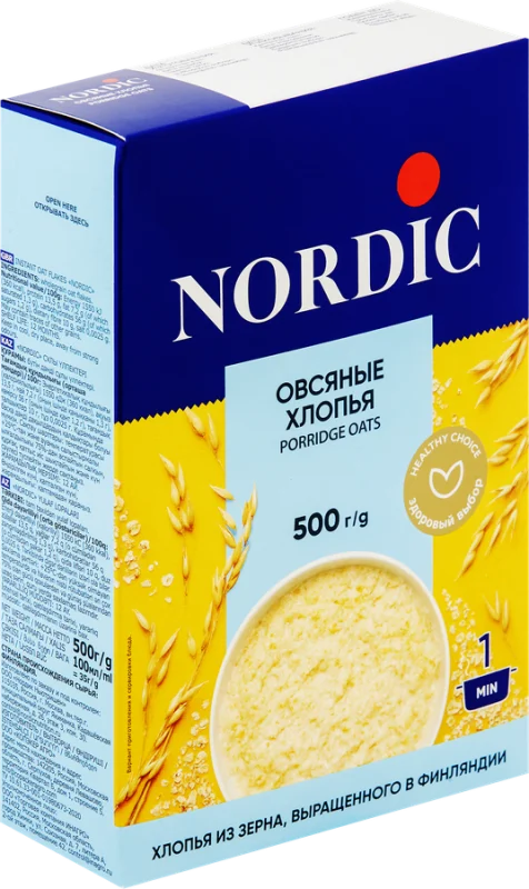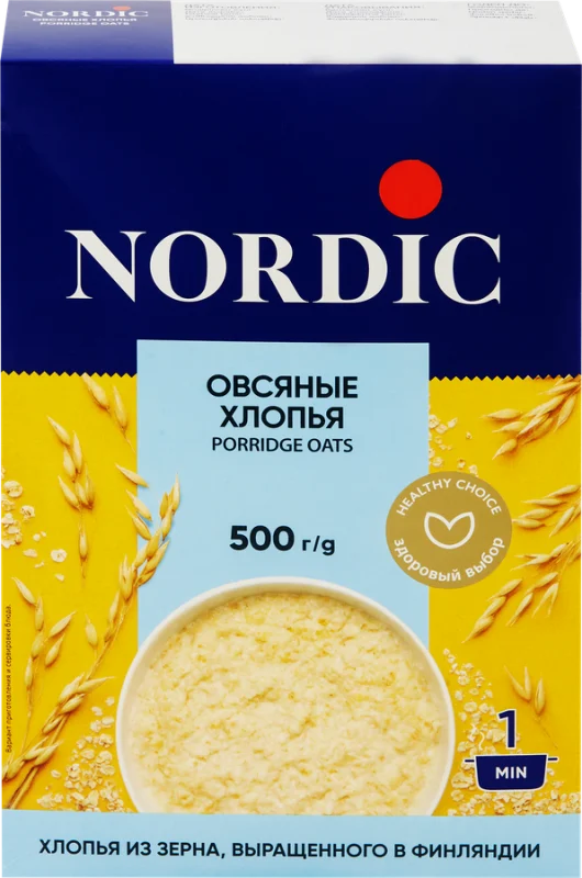 Хлопья овсяные NORDIC ценятся за пользу и вкус. Каша из овсяных хлопьев питательна. Овсяная крупа богата белками, углеводами, калием, фосфором, цинком, фтором, йодом, провитамином A, витаминами группы В. Хлопья овсянки содержат почти все необходимые человеку полезные аминокислоты и микроэлементы, включая железо и эфирные масла. Продукт не содержит консервантов, ароматизаторов и красителей.