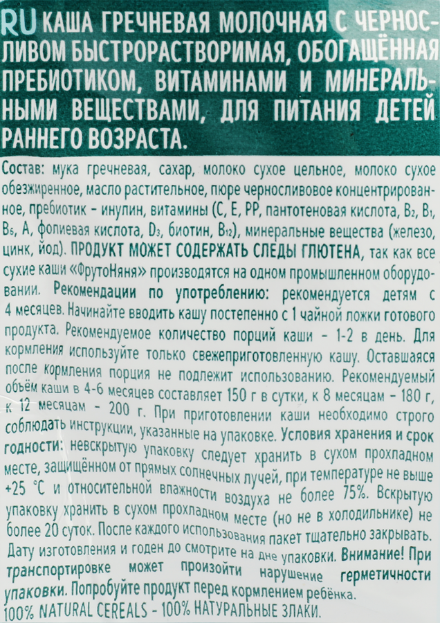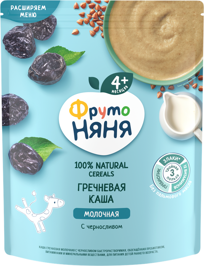 Сухая молочная гречневая каша ФРУТОНЯНЯ с черносливом отлично подходит для первого прикорма детей от 4 месяцев. Ведь гречка – гипоаллергенный продукт, который идеально дополнит рацион малышей раннего возраста. Гречневая каша ФРУТОНЯНЯ очень вкусная и полезная, ведь у нее натуральный состав без красителей, консервантов и ГМО. Она дополнительно обогащена целым комплексом витаминов и минеральных веществ, чтобы ваш малыш рос здоровым и энергичным, а также пребиотиком, улучшающим пищеварение.