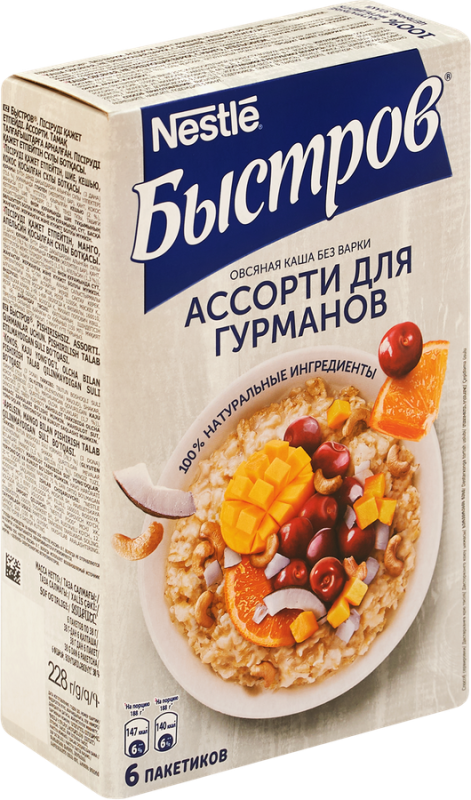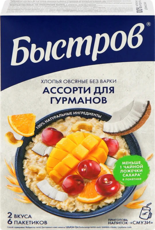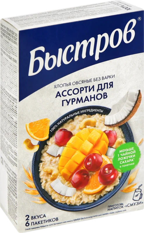Каша овсяная БЫСТРОВ Ассорти для гурманов, Вишня, кешью, кокос и Манго, апельсин поможет быстро приготовить питательный и вкусный завтрак. Она не только насыщает и заряжает энергией, но и приносит пользу организму. Овсяная каша богата витаминами, фосфором, калием, магнием и другими элементами. Включение такого продукта в рацион нормализует пищеварение, улучшает перистальтику кишечника, снижает уровень холестерина в крови и риск развития сердечно-сосудистых заболеваний.