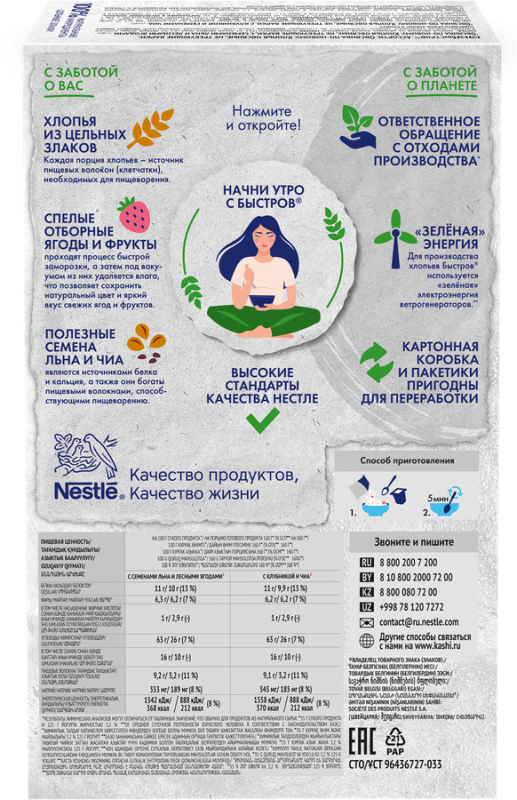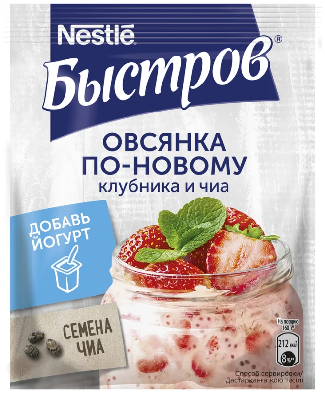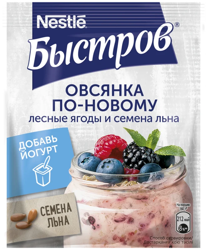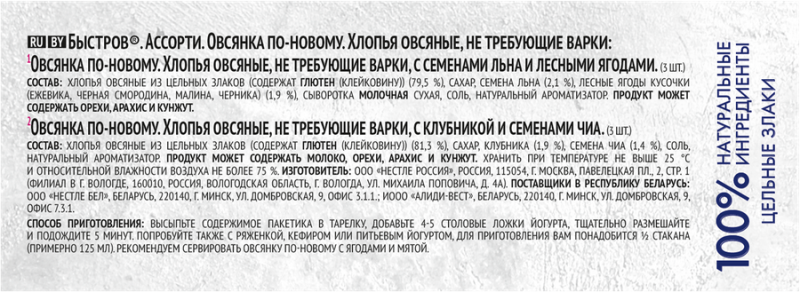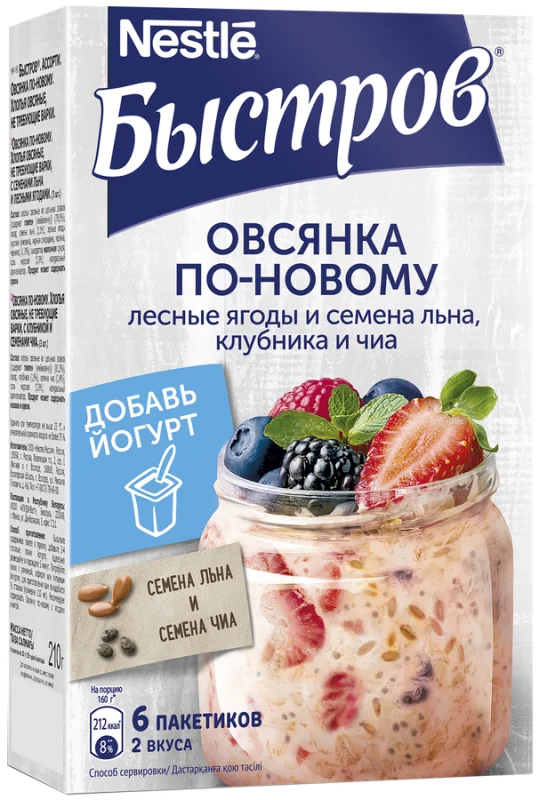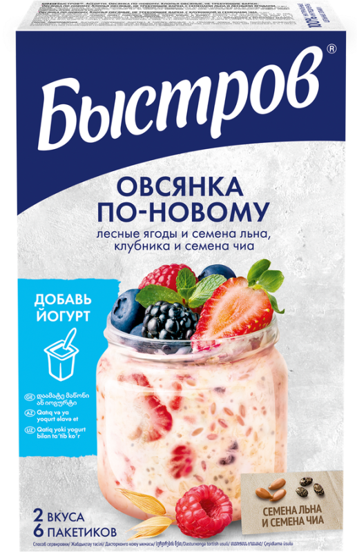 Каша овсяная БЫСТРОВ Ассорти, с семенами льна и лесными ягодами, с клубникой и семенами чиа – это трендовый современный завтрак. Нежные овсяные хлопья с кусочками натуральных ягод, семенами льна и чиа, которые можно за 5 минут приготовить по-новому – с йогуртом, ряженкой, кефиром. Ягоды, высушенные по современной технологии, сохранили пользу, насыщенный вкус и красоту нежной, сочной мякоти. В овсяных хлопьях, сделанных из цельных злаков, сохранены самые полезные части зерна, в которых содержится клетчатка, витамины и минеральные вещества.