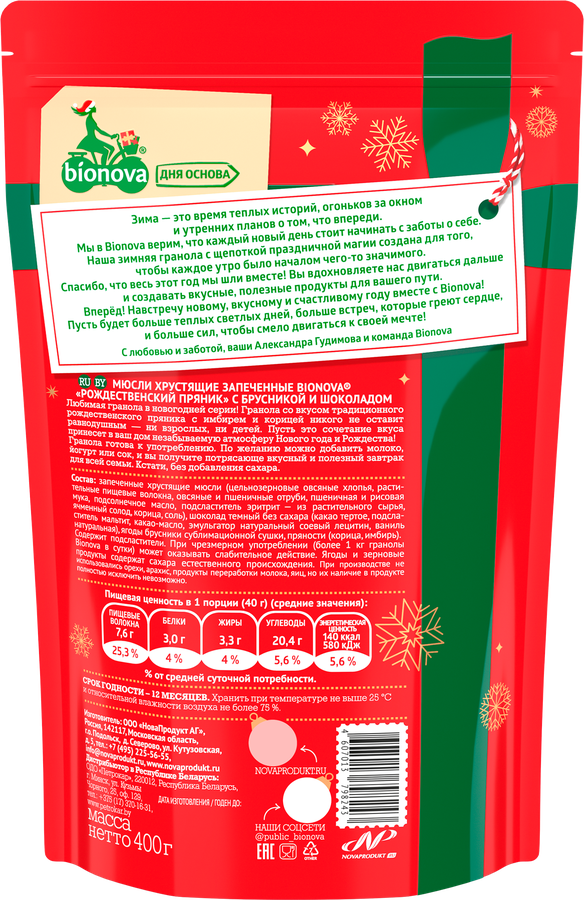 Мюсли BIONOVA Crunchy Брусничный пряник, 400г