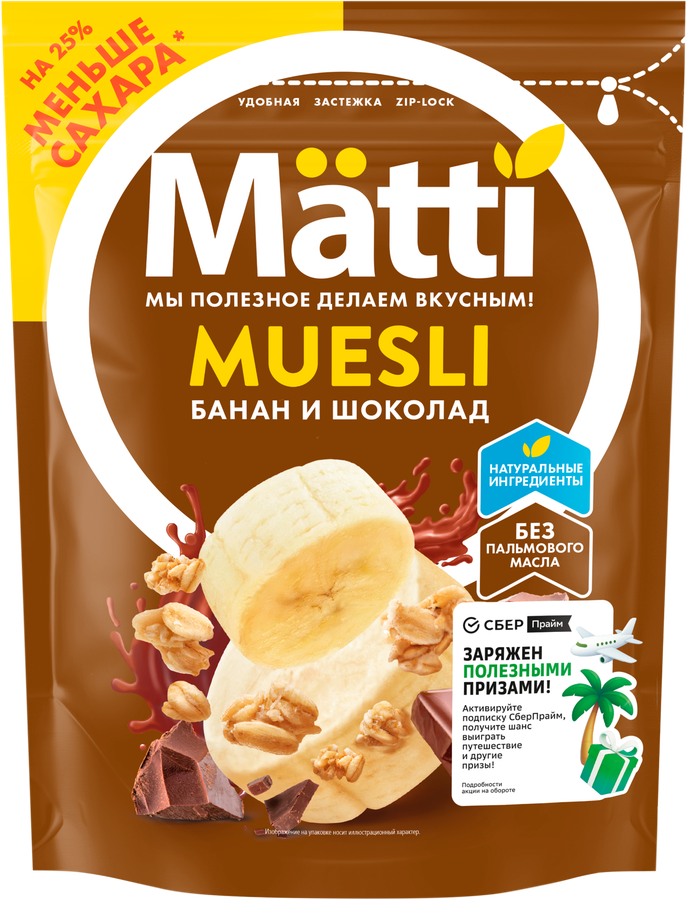 Мюсли MATTI Банан и шоколад – вкусный вариант для сбалансированного и полезного завтрака на каждый день. Овсяные хлопья богаты клетчаткой, минеральными веществами и витаминами, которые способствуют выведению шлаков из организма, регулируют работу пищевого тракта, снижают уровень сахара в крови. Банан – источник энергии, самый вкусный и безопасный антидепрессант. Этот фрукт богат витаминами и микроэлементами. Витамин C, входящий в состав бананов является антиоксидантом и замедляет процесс старения организма. Шоколад заряжает бодростью и улучшает настроение, помогает улучшить память, повысить устойчивость к стрессам и укрепить иммунитета, также полезен для сердца и сосудов. Вкус и свежесть продукта позволит надолго сохранить упаковка с удобной застежкой zip-lock.