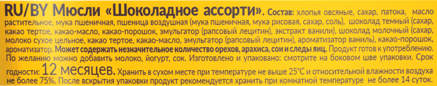 хлопья овсяные,мука пшеничная,патока,сахар,пшеница воздушная мука пшеничная,мука рисовая,сахар,соль,масло подсолнечноевысокоолеиновое,шоколад тёмный сахар,какао тертое,какао масло,эмульгатор: лецитин подсолнечный,ароматизатор натуральный»ваниль»,шоколад молочный сахар,молоко сухое цельное,какао масло,какао тертое,молоко сухое обезжиренное,эмульгатор: лецитинподсолнечный,ароматизатор натуральный «ваниль»,какао-порошок,ароматизатор натуральный,антиокислители: кислотааскорбиновая,токоферолы,концентрат смеси; эмульгатор: лецитин соевый.После вскрытия упаковки продукт рекомендуется хранить прикомнатной температуре не более 14 суток.СГ — 365 дней