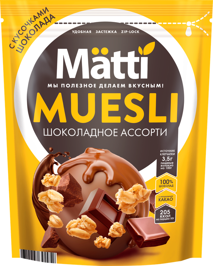 Мюсли MATTI Шоколадное ассорти станут удачным вариантом полезного и питательного завтрака, полдника, подойдут для быстрого перекуса и восстановления сил в течение дня. Продукт полностью готов к употреблению, в него можно добавлять молоко, йогурт, сок и другие напитки. Мюсли также можно использовать в качестве ингредиента открытых пирогов и различных десертов.