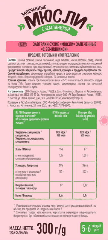 Хлопья овсяные, хлопья пшеничные, вода питьевая, масло рапсовое, сахар, клюква сушеная резаная (клюква, рисовая мука), патока,экструдированные воздушные шарики (рисовая мука, пшеничная мука, вода питьевая), мука пшеничная, земляника сублимированная, соль.