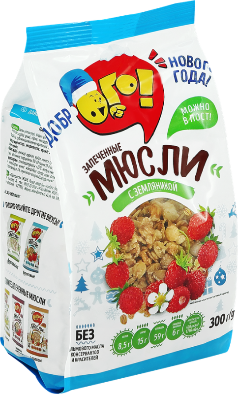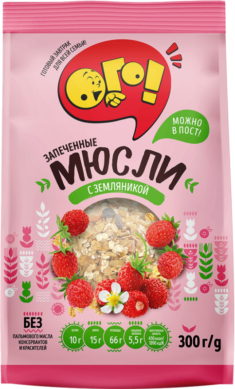 Мюсли запеченные ОГО! с земляникой станут удачным вариантом полезного и питательного завтрака, полдника, подойдут для быстрого перекуса и восстановления сил в течение дня. Продукт полностью готов к употреблению, в него можно добавлять молоко, йогурт, сок и другие напитки. Мюсли также можно использовать в качестве ингредиента открытых пирогов и различных десертов.