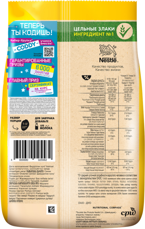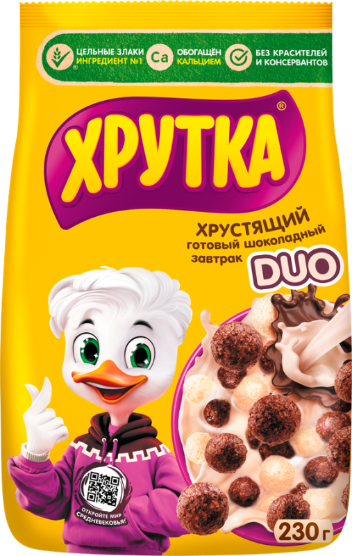 Готовый завтрак ХРУТКА Duo ‒ это готовый завтрак с воздушными шариками двух цветов, который легко превратит утро в веселую игру. Больше не придется тратить время на приготовление завтрака и уговаривать домочадцев съесть еще одну ложку, ведь завтрак ХРУТКА Duo такой вкусный! И не надо выбирать между вкусным и полезным ‒ входящие в состав шариков цельные злаки помогают обеспечить организм важными питательными веществами: сложными углеводами, белками и клетчаткой. А кальций важен для поддержания здоровья костей и зубов. Воздушные шарики Duo можно залить молоком, кефиром или йогуртом, которые добавят завтраку еще больше полезных веществ. Вкусные шарики ХРУТКА Duo подарят заряд энергии и позитивные впечатления на все утро!