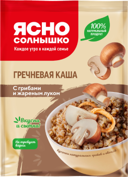Хлопья гречневые, не требующие варки, кусочки грибов шампиньонов, сушенных сублимационной сушкой, лук сушеный жареный, соль.