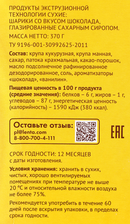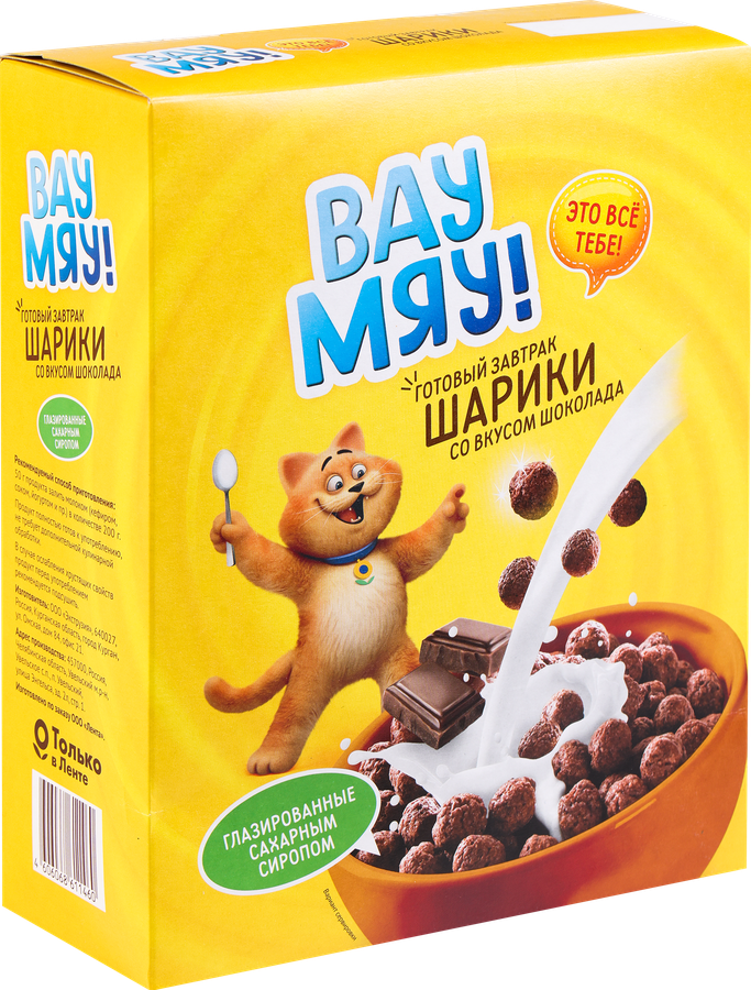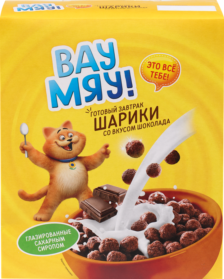 Готовый завтрак ВАУ МЯУ Шарики, со вкусом шоколада выполнен в виде объемных пористых фигурок. Цвет шариков варьируется от светло-коричневого до темно-коричневого. Сладкие хрустящие фигурки покрыты глазурью. Продукт получен методом экструзионной технологии. Он полностью готов к употреблению и не требует дополнительной кулинарной обработки.