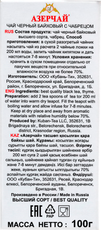 Чай черный АЗЕРЧАЙ байховый с чабрецом листовой – микс черного чая высшего сорта и свежесобранного чабреца. В каждой коробке чая вы найдете аромат трав горных склонов. Чайный напиток позволит насладиться изысканным вкусом и получить настоящее вкусовое наслаждение.