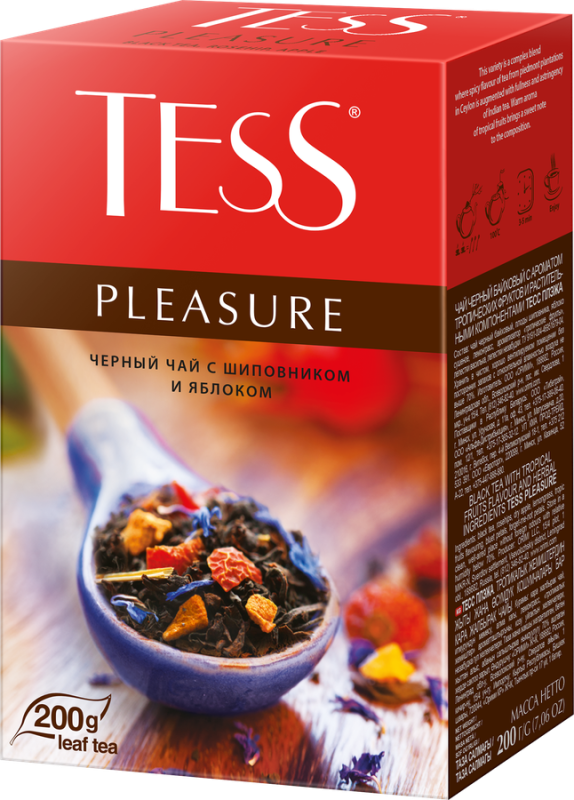 TESS Pleasure – это выразительная композиция из черного чая, шиповника, сушеных яблок и цветочных лепестков. В напитке гармонично сочетается легкая пряность цейлонского чая, тонкие оттенки фруктов и нежный аромат с цветочными и карамельными нотами.