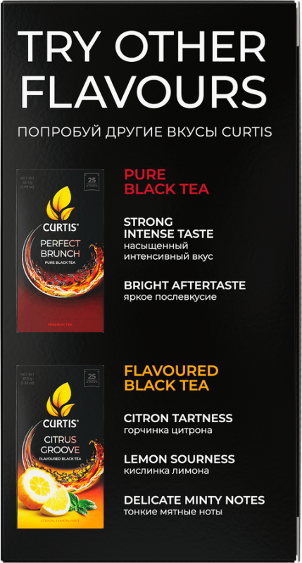 Чай черный CURTIS Elegant Earl Grey – чёрный высокогорный чай с ароматом бергамота и цедрой цитрусовых. Наслаждайся перерывом с изысканным вкусом чая Curtis Elegant Earl Grey. Попробуйте идеальное сочетание чёрного цейлонского чая и цитрусовых.
