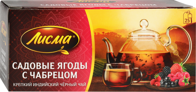 Чай черный ЛИСМА Садовые ягоды с чабрецом – яркое сочетание натуральной малины, клубники, земляники, черной смородины и ежевики, которое позволит вам ощутить нежный аромат спелых садовых ягод. Душистый чабрец удачно оттеняет их сладость, раскрывая всю полноту вкуса крепкого индийского черного чая. Насыщенный темный настой дарит хорошее настроение и согревает в любое время суток.