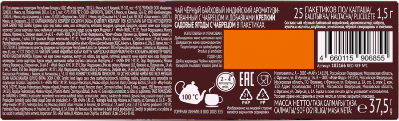 Чай черный байховый индийский, ароматизатор, чабрец, кусочки малины, клубники, земляники, черной смородины и ежевики.
