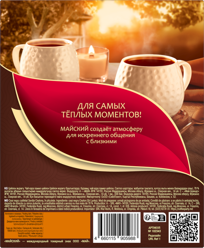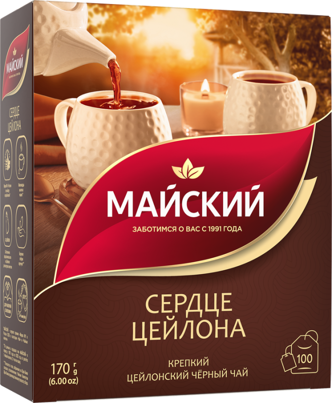 Чай черный МАЙСКИЙ Сердце цейлона цейлонский, листовой – крепкий купаж лучших сортов из самого сердца Цейлона. Благодаря длительному процессу ферментации чайные листья сохраняют насыщенный ароматс нотами печеного яблока и вишни, придают напитку стабильную крепость и делают его вкус глубоким и интенсивным. При заваривании цейлонский черный чай дает насыщенный бордовый оттенок настоя. Подойдет для употребления в любое время суток.