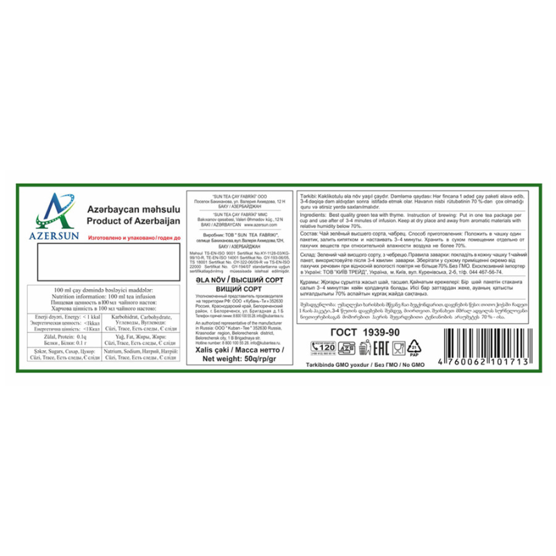 Чай зеленый АЗЕРЧАЙ с чабрецом, 25пак