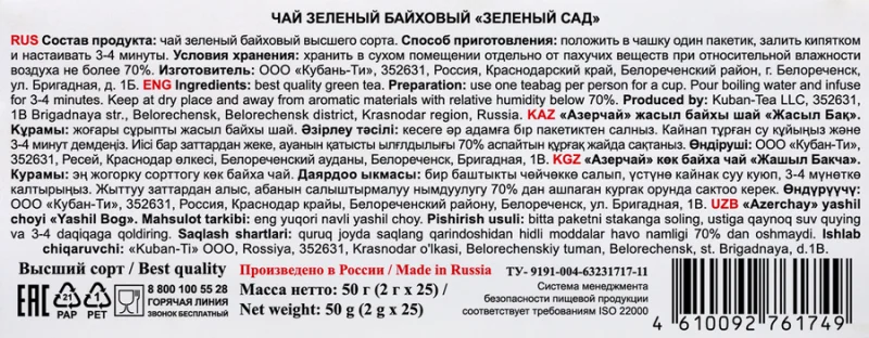 Чай зеленый АЗЕРЧАЙ Зеленый Сад, 25пак