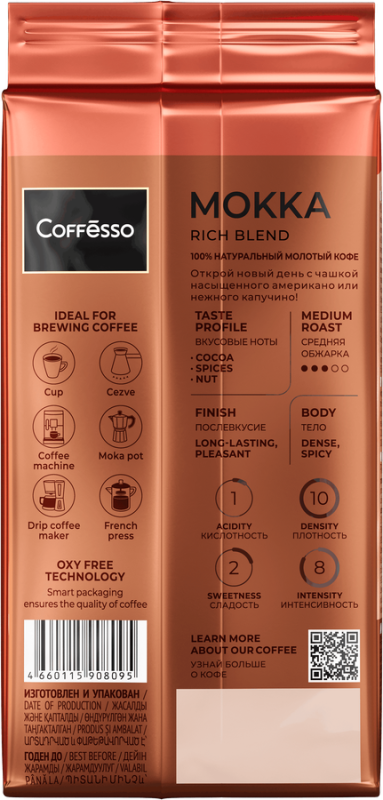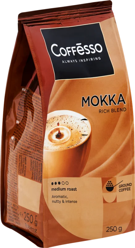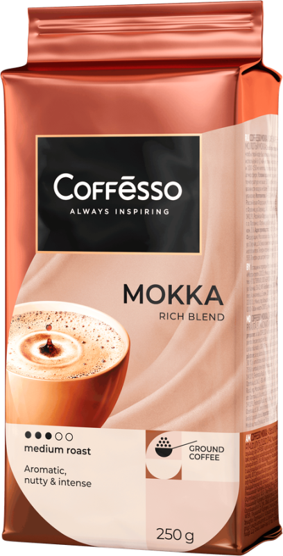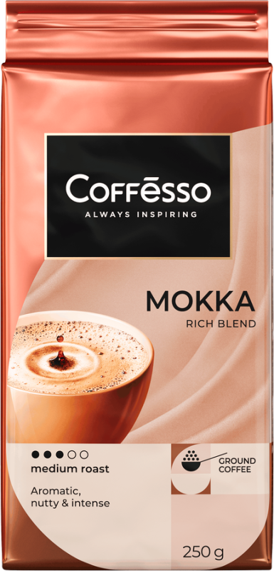 Кофе молотый COFFESSO Mokka – богатый, глубокий вкус с характерной кофейной горчинкой и глубокой насыщенностью. Он позволяет приготовить густой, плотный кофе как для американо и эспрессо, так и для напитков с молоком, чтобы настроить чувства на события нового дня.