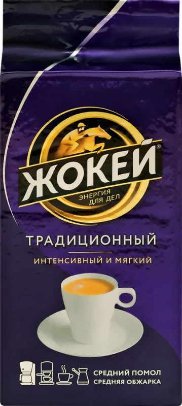 Кофе молотый ЖОКЕЙ Традиционный жареный ‒ бленд, объединяющий отборные сорта кофе из Индии и Вьетнама, позволит насладиться кофе во французском стиле ‒ плотный, густой вкус с приятной горчинкой удивительно сочетается с легкими сладко-ванильными нотами в аромате.