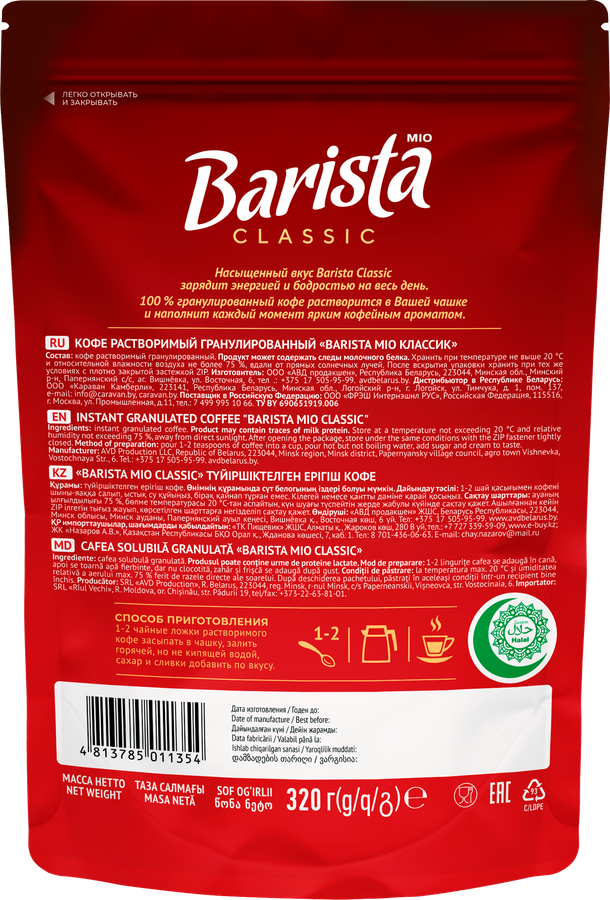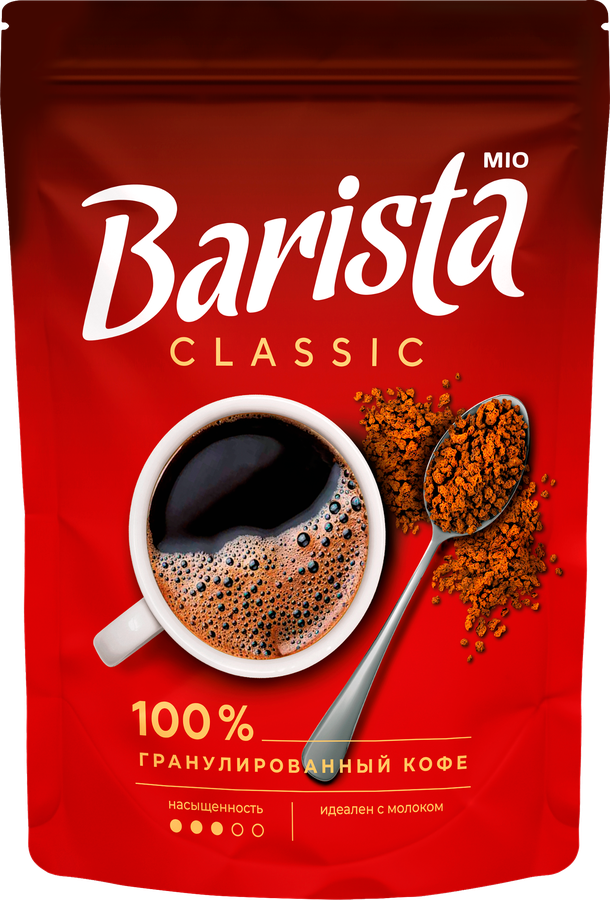 Кофе растворимый BARISTA MIO Classic с насыщенным вкусом и богатым ароматом зарядит энергией и бодростью на весь день. 100% гранулированный кофе полностью растворится в чашке и наполнит каждый момент ярким кофейным ароматом.