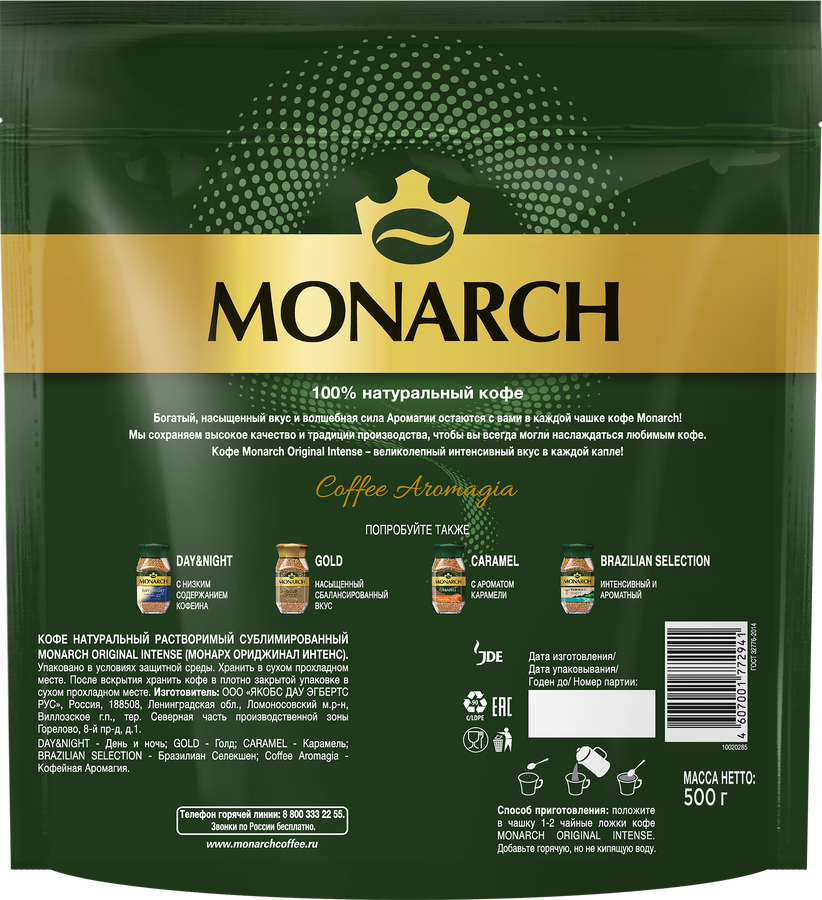 Кофе растворимый MONARCH Original intense натуральный сублимированный обладает богатым насыщенным вкусом и выразительным ароматом. Он моментально дарит заряд бодрости, тонизирует, возвращает утраченные силы и повышает работоспособность. По желанию кофе можно дополнить сахаром, молоком или сливками.