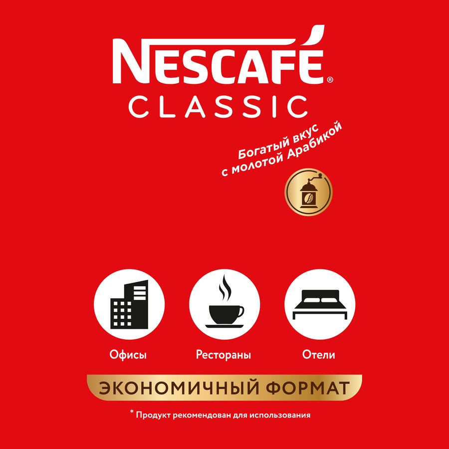 Кофе растворимый с добавлением молотого НЕСКАФЕ Классик натуральный жареный – это 100% натуральный растворимый напиток, приготовленный только из отборного сырья. Секрет насыщенного вкуса и богатого аромата этого кофе кроется в добавлении молотых зерен арабики, которые вы можете не только почувствовать, но и увидеть в чашке. Богатый вкус и аромат способны пробудить все ваши чувства. Кофе растворимый с добавлением молотого НЕСКАФЕ Классик натуральный жареный взбодрит с утра и вдохновит на яркие достижения, которыми можно поделиться с коллегами за чашечкой ароматного кофе. Подходит для использования в офисах, отелях и ресторанах.