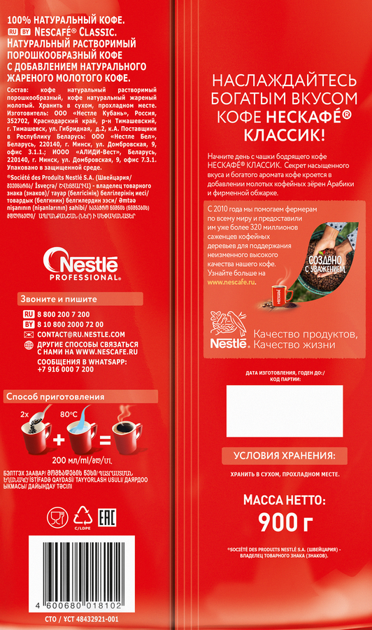 Кофе растворимый с добавлением молотого НЕСКАФЕ Классик натуральный жареный, 900