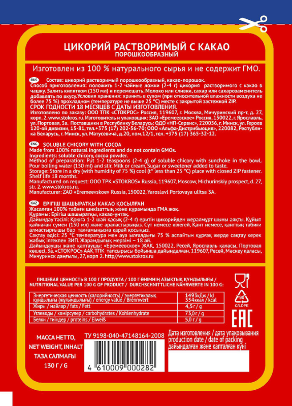 Цикорий РУССКИЙ ЦИКОРИЙ с добавлением какао в виде порошка – интересный продукт для истинных любителей данного напитка, ведь это новый продукт в рационе, который совмещает в себе пользу и насыщенный вкус. Инулин (растительное пищевое волокно), содержащийся в корне цикория, улучшает микрофлору кишечника – стимулирует рост и активность полезных бифидобактерий. Специальная упаковка ZIP-lock с фольгированным слоем исключает попадание солнечного света и влаги, не допуская кристаллизации продукта, сохраняя его пользу и аромат.