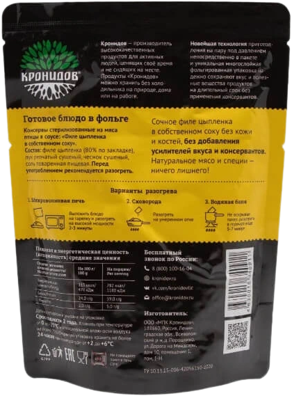 Филе цыпленка (не менее 80%), лук репчатый сушеный, соль поваренная пищевая, специи и пряности.